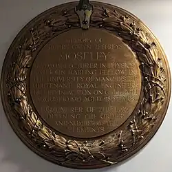 Memorial plaques to Moseley were installed at Manchester and Eton, and a Royal Society scholarship, established by his will, had as its second recipient the physicist P. M. S. Blackett, who later became president of the Society.[14]: 126 The Institute of Physics Henry Moseley Medal and Prize is named in his honour.[31]