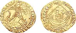 Gold "Angel" coin of Henry's later reign, struck in either London or York, showing the Archangel Michael (hence the coin's name) slaying the Dragon (left), and Henry's shield being carried aboard a ship (right)
