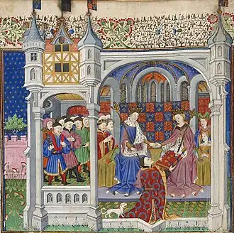 Better prospects for England arose amid a growing effort by French lords to resist the growing power of the French monarchy, a conflict which culminated in the Praguerie revolt of 1440.[11] Though the English failed to take advantage of the Praguerie itself, the prospect of gaining the allegiance of one of Charles VII's more rebellious nobles was attractive from a military perspective. In about 1441, the recently ransomed Charles, Duke of Orléans, in an attempt to force Charles VII to make peace with the English, suggested a marriage between Henry VI and Isabella of Armagnac, daughter of John IV, Count of Armagnac,[12] a powerful noble in southwestern France who was at odds with the Valois crown.[13] An alliance with Armagnac would have helped to protect English Gascony from increasing French threats in the region, especially in the face of defections to the enemy by local English vassals,[14] and might have helped to wean some other French nobles to the English party.[15] The proposal was seriously entertained between 1441 and 1443, but a massive French campaign in 1442 against Gascony disrupted the work of the ambassadors[16] and frightened the Count of Armagnac into reluctance.[17] The deal fell through due to problems in commissioning portraits of the Count's daughters[18] and the Count's imprisonment by Charles VII's men in 1443.[19]