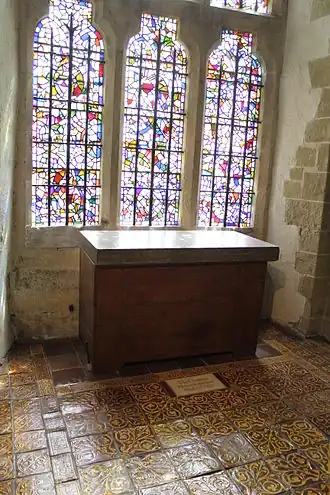 Nonetheless, while he was in hiding at Waddington Hall, in Waddington, Lancashire, the home of Sir Richard Tempest, he was betrayed by "a black monk of Addington" and on 13 July 1465, a party of Yorkist men, including Sir Richard's brother John, entered the house for his arrest. Henry fled into nearby woods but was soon captured at Brungerley Hippings (stepping stones) over the River Ribble.[39] He was subsequently held captive in the Tower of London.[40][41]