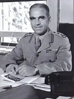 Raised to substantive lieutenant general on 12 April 1954,[3] Wells was appointed a Companion of the Order of the Bath in the Queen's Birthday Honours that June.[53] He was commended for his "exceptional meritorious service" in Korea,[54] and awarded the United States' Legion of Merit in the degree of Commander.[55] Presented with the decoration by General John E. Hull on 19 October,[54] Wells returned to Australia three days later.[50] In December, he was made Chief of the General Staff; the professional head of the Australian Army. Wells' appointment coincided with the commitment of Australian forces to the Malayan Emergency, and as such he presided over the deployment of soldiers to the engagement as well as the formation of the first regular brigade group.[3] He was upgraded to a Knight Commander of the Order of the British Empire in the 1956 New Years Honours.[56]