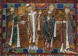 The grandfather of Henry the Lion, the Bavarian Duke Henry the Black, married Wulfhild, the eldest daughter of the Saxon Duke Magnus Billung and Sophia, the daughter of the Hungarian King. Large tracts of land around Luneberg the center of power and the burial place of the House of Billung, now went to the Welfs. In 1123 a relative of the family, Bishop Conrad of Constance, was put forward for canonisation, and raised the reputation of the family. The Welf Judith, daughter of Henry the Black, married the Hohenstaufen Duke Frederick II, the father of Frederick Barbarossa. The candidacy of Frederick II as the successor to the ore rich lands of the late, childless Henry V stayed unsponsored. Instead, the Saxon duke Lothar III was preferred. The usual sponsors of Henry the Black were split between him and Duke Lothar. Some of these sponsors were won over by Lothar marrying his only daughter Gertrude to Henry's son, Henry the Proud. Gertrude’s mother was Richenza, heiress of the Saxon territories of Northeim and the properties of the Brunones, counts of Brunswick. From this union came Henry the Lion.[5] He was born in Ravensburg.[2] From the Steterburger Chronik, he must have been born around 1129/1130. His baptism was around 1135/36, but this seems a long time to wait for a baptism. It is possible that the copyist made a transcription error, so Henry's birth could have been in 1133/35.[5]