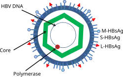 Hepatitis B virus (HBV) is a member of the hepadnavirus family.[39] The virus particle (virion) consists of an outer lipid envelope and an icosahedral nucleocapsid core composed of core protein. These virions are 30–42 nm in diameter. The nucleocapsid encloses the viral DNA and a DNA polymerase that has reverse transcriptase activity.[40] The outer envelope contains embedded proteins that are involved in viral binding of, and entry into, susceptible cells. The virus is one of the smallest enveloped animal viruses. The 42 nm virions, which are capable of infecting liver cells known as hepatocytes, are referred to as "Dane particles".[41] In addition to the Dane particles, filamentous and spherical bodies lacking a core can be found in the serum of infected individuals.[42] These particles are not infectious and are composed of the lipid and protein that forms part of the surface of the virion, which is called the surface antigens (HBsAg), and is produced in excess during the life cycle of the virus.[43]