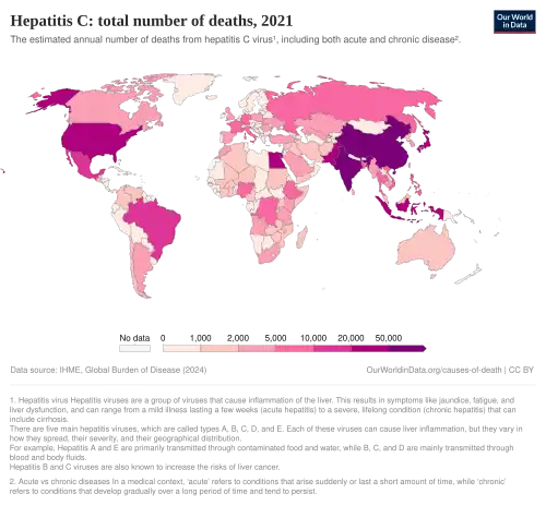 The World Health Organization estimated in a 2021 report that 58 million people globally were living with chronic hepatitis C as of 2019.[12] About 1.5 million people are infected per year, and about 290,000 people die yearly from hepatitis C–related diseases, mainly from liver cancer and cirrhosis.[4]