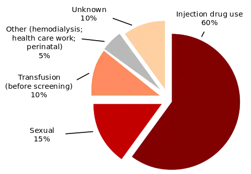 Percutaneous contact with contaminated blood is responsible for most infections; however, the method of transmission is strongly dependent on both geographic region and economic status.[54] Indeed, the primary route of transmission in the developed world is injection drug use, while in the developing world the main methods are blood transfusions and unsafe medical procedures.[3][55] The cause of transmission remains unknown in 20% of cases;[56] however, many of these are believed to be accounted for by injection drug use.[15]