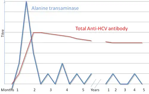 About 70% of those exposed to the virus develop a chronic infection.[4] This is defined as the presence of detectable viral replication for at least six months. Though most experience minimal or no symptoms during the initial few decades of a chronic infection,[18] chronic hepatitis C can be associated with fatigue[19] and mild cognitive problems.[20] After several years, chronic infection may cause cirrhosis or liver cancer.[5] The liver enzymes measured from blood samples are normal in 7–53%.[21] (Elevated levels indicate the virus or other disease is damaging liver cells). Late relapses after apparent cure have been reported, but these can be difficult to distinguish from reinfection.[21]