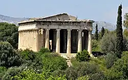 Hephaestus is to the male gods as Athena is to the female goddesses, for he was believed to have taught the mortals crafts and arts alongside Athena.[64] At Athens, they had temples and festivals in common.[d] Both were believed to have great healing powers, and Lemnian earth (terra Lemnia), from the spot on which Hephaestus had fallen, was believed to cure madness, snakebite and haemorrhage; priests of Hephaestus knew how to cure wounds inflicted by snakes.[65] He was represented in the temple of Athena Chalcioecus (Athena of the Bronze House[66]) at Sparta, in the act of delivering his mother;[67] on the chest of Cypselus, giving Achilles's armor to Thetis;[68] and at Athens there was the famous statue of Hephaestus by Alcamenes, in which his physical disability was only subtly portrayed.[69] He had almost "no cults except in Athens".[16] The Greeks frequently placed miniature statues of Hephaestus near their hearths, and these figures are the oldest of all his representations.[70] In Athens, there is a Temple of Hephaestus, the Hephaesteum (miscalled the "Theseum") near the agora. Athena is sometimes thought to be the "soulmate" of Hephaestus.[71] Nonetheless, Hephaestus "seeks impetuously and passionately to make love to Athena: at the moment of climax she pushes him aside, and his semen falls to the earth where it impregnates Gaia."[72]