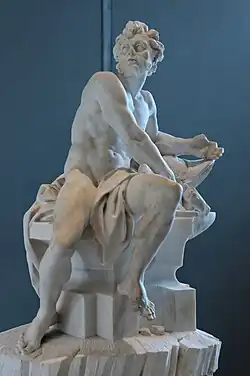 Hephaestus fought against the Giants and killed Mimas by throwing molten iron at him.[41] He also fought another Giant, Aristaeus, but he fled.[42] During the battle Hephaestus fell down exhausted, and was picked up by Helios in his chariot. As a gift of gratitude, Hephaestus forged four ever-flowing fountains and fire-breathing bulls for Helios's son Aeëtes.[43]