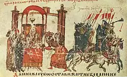 The Roman army proceeded to Armenia, inflicted a defeat on an army led by a Persian-allied Arab chief, and then won a victory over the Persians under Shahrbaraz.[33] Heraclius would stay on campaign for several years.[34][35] On 25 March 624,[36] he again left Constantinople with his wife, Martina, and his two children; after he celebrated Easter in Nicomedia on 15 April, he campaigned in the Caucasus, winning a series of victories in Armenia against Khosrow and his generals Shahrbaraz, Shahin, and Shahraplakan.[37][38] In the same year the Visigoths succeeded in recapturing Cartagena, capital of the western Byzantine province of Spania, resulting in the loss of one of the few minor provinces that had been conquered by the armies of Justinian I.[39] In 626 the Avars and Slavs supported by a Persian army commanded by Shahrbaraz, besieged Constantinople, but the siege ended in failure (the victory was attributed to the icons of the Virgin which were led in procession by Sergius about the walls of the city),[40] while a second Persian army under Shahin suffered another crushing defeat at the hands of Heraclius's brother Theodore.