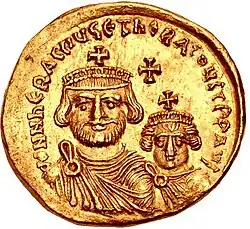 - ^ His full imperial titulature is attested in Greek as Αὐτοκράτωρ καῖσαρ φλάβιος ἡράκλειος πιστὸς ἐν χριστῷ ἡμερότατος μέγιστος εὐεργέτης εἰρηνικὸς ἀλαμαννικὸς γοτθικὸς φραγγικὸς γερμανικὸς ἀντικὸς ἀλανικὸς οὐανδαλικὸς ἀφρικανὸς ἐρουλικὸς γηπεδικὸς εὐσεβὴς εὐτυχὴς ἔνδοξος νικητὴς τροπαιοῦχος ἀεισέβαστος αὔγουστος ("Emperor Caesar Flavius Heraclius, faithful in Christ, most mild, greatest benefactor, peaceable; victor over the Alamanni, Goths, Franks, Germans, Antes, Alans, Vandals, Africans; pious, fortunate, renowned, victorious and triumphant, ever-venerable augustus").[2] Those exact victory titles were used by Justinian I and his successors.