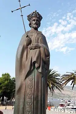 Bosnia could not make economical use of Bosansko Primorje, as its share of the Adriatic coast from the river Neretva to the Bay of Kotor lacked any major settlements.[4][5] In the second half of the 14th century area in Bay of Kotor also became part of the Kingdom of Bosnia. The Bosnian king, Tvrtko, embroiled in the War of Chioggia, which erupted between the old-time rival Republics of Venice and Genoa in 1378 will, as a result, find himself pressured by the circumstances of failure to seize Kotor, the damage to the Bosnian economy from the Ragusan embargo, and the need for easy access to maritime trade.[6][7] This and the fact that Bosansko Primorje had no significant port led Tvrtko to found the youngest medieval town on the eastern Adriatic coast.[8] In early 1382, Tvrtko constructed a new fortress in the Bay of Kotor on the place of a small fishing village and decided that it should form the basis of a new salt trading center. Initially named after Saint Stephen, the city immediately came to be known as Novi (meaning "new").[8]