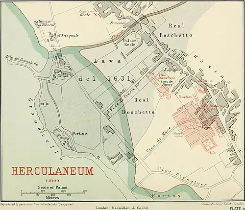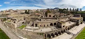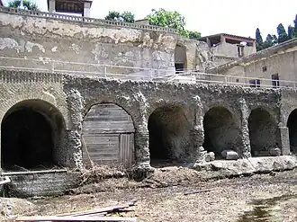 Smaller than Pompeii with a population of circa 5,000,[3] Herculaneum was a wealthier town.[4] It was a seaside retreat for the Roman elite, as reflected by the extraordinary density of luxurious houses featuring lavish use of coloured marble cladding. Buildings of the ancient city include the Villa of the Papyri and the so-called "boat houses", wherein the skeletal remains of at least 300 people were found.