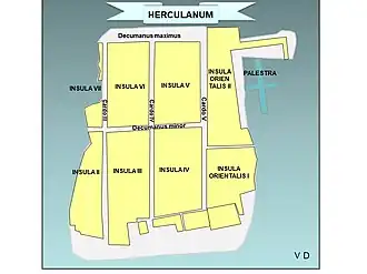 The classical street layout separates the city into blocks (insulae), defined by the intersection of the east–west (cardi) and north–south (decumani) streets. Hence Insula II to Insula VII run counterclockwise from Insula II. To the east are two additional blocks: Orientalis I (oI) and Orientalis II (oII). To the south of Orientalis I (oI) lies one additional group of buildings known as the "Suburban District" (SD). Individual buildings have their own entrance number. For example, the House of the Deer is labelled (Ins IV, 3).