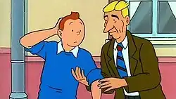 Hergé developed a character named Tintin as a Belgian boy reporter who could travel the world with his fox terrier, Snowy – "Milou" in the original French – basing him in large part on his earlier character of Totor and also on his own brother, Paul.[39] Degrelle later falsely claimed that Tintin had been based on him, while he and Hergé fell out when Degrelle used one of his designs without permission; they settled out-of-court.[40] Although Hergé wanted to send his character to the United States, Wallez instead ordered him to set his adventure in the Soviet Union, acting as a work of anti-socialist propaganda for children. The result, Tintin in the Land of the Soviets, began serialisation in Le Petit Vingtième on 10 January 1929, and ran until 8 May 1930.[41] Popular in Francophone Belgium, Wallez organized a publicity stunt at the Gare de Nord station, following which he organized the publication of the story in book form.[42] The popularity of the story led to an increase in sales, and so Wallez granted Hergé two assistants, Eugène Van Nyverseel and Paul "Jam" Jamin.[43]