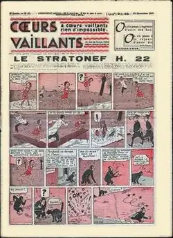 The first issue of Tintin magazine was published on 26 September 1946.[145] Hergé was assigned to produce a two-page spread each week, and began by concluding The Seven Crystal Balls before embarking on its successor story, Prisoners of the Sun.[139] Alongside Hergé's Adventures of Tintin, the magazine also included Laudy's The Legend of the Four Aymon Brothers and Jacobs' The Secret of the Swordfish, the first in his new Blake and Mortimer series.[140] While the magazine was in competition with a number of rivals, most notably Spirou, famous for serialising the Lucky Luke and Buck Danny comics,[146] it proved an immediate success, with 60,000 copies being sold in three days of its release.[140] Its publication resulted in a massive boost to Hergé's book sales too.[139]