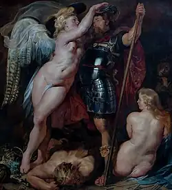 A classical hero is considered to be a "warrior who lives and dies in the pursuit of honor" and asserts their greatness by "the brilliance and efficiency with which they kill".[9] Each classical hero's life focuses on fighting, which occurs in war or during an epic quest. Classical heroes are commonly semi-divine and extraordinarily gifted, such as Achilles, evolving into heroic characters through their perilous circumstances.[4] While these heroes are incredibly resourceful and skilled, they are often foolhardy, court disaster, risk their followers' lives for trivial matters, and behave arrogantly in a childlike manner.[4] During classical times, people regarded heroes with the highest esteem and utmost importance, explaining their prominence within epic literature.[10] The appearance of these mortal figures marks the evolution of audiences and writers turning away from immortal gods to mortal mankind, whose heroic moments of glory survive in the memory of their descendants, extending their legacy.[4]
