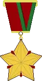 The recipient of the title is given a medal called the Medal of the Hero of Belarus (Belarusian: медаль Героя Беларусі, Russian: медаль Героя Беларуси). The star and suspension are made of gold, and thus it is nicknamed "Gold Star", as was its predecessor, the Hero of the Soviet Union. The star has a total diameter of 33 millimeters, and is attached to a rectangular suspension device (boot tree). In the center of the rectangle is a ribbon of two sections of red and one section of green. The red and green bars on the ribbon evoke the design and colors of the national flag. The amount of gold is set at 585–1 Test, with the total weight of the medal being 19 grams.[7] The present design was enacted into law by Presidential Decree Number 516 on September 6, 1999.[8]