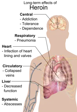 Common side effects include respiratory depression (decreased breathing), dry mouth, drowsiness, impaired mental function, constipation, and addiction.[12] Use by injection can also result in abscesses, infected heart valves, blood-borne infections, and pneumonia.[12] After a history of long-term use, opioid withdrawal symptoms can begin within hours of the last use.[12] When given by injection into a vein, heroin has two to three times the effect of a similar dose of morphine.[3] It typically appears in the form of a white or brown powder.[12]