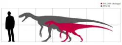Herrerasaurus was originally considered to be a genus within Carnosauria, which then included forms similar to Megalosaurus and Antrodemus (the latter is probably equivalent to Allosaurus[47]), even though Herrerasaurus lived many millions of years before them and therefore would have retained multiple primitive features. This carnosaurian classification was amended upon by Rozhdestvensky and Tatarinov in 1964, who classified Herrerasaurus within the family Gryponichidae inside Carnosauria. The same year, Walker published a differing opinion that Herrerasaurus instead was allied with Plateosauridae, although it differed in possessing a pubic boot. Walker also proposed that Herrerasaurus may instead be close to Poposaurus (now considered a pseudosuchian[48]) and the unnamed theropod from the Dockum Group of Texas (now assigned to the rauisuchian Postosuchus[49]). In 1985, Charig noted that Herrerasaurus was of uncertain classification, showing similarities to both "prosauropods" and "carnosaurians". Romer (1966), simply noted that Herrerasaurus was a prosauropod possibly within Plateosauridae. In the description of Staurikosaurus, Colbert noted that there were many similarities between his taxon and Herrerasaurus, but classified them in separate families, with Herrerasaurus in Teratosauridae. In 1970, Bonaparte also proposed similarities between Herrerasaurus and Staurikosaurus, and while classifying them both clearly as in Saurischia, he stated that they appeared as though they could not be placed in a current family. This was further supported by Benedetto in 1973, who named for the taxa the new family Herrerasauridae, which he classified as saurischians, possibly within Theropoda but not in Sauropodomorpha.[50] However, in 1977 Galton proposed that Herrerasauridae only included Herrerasaurus, and found it to be Saurischian incertae sedis.[51]