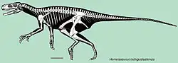Herrerasaurus is likely a genus of saurischian dinosaur from the Late Triassic period. Measuring 6 m (20 ft) long and weighing around 350 kg (770 lb), this genus was one of the earliest dinosaurs from the fossil record. Its name means "Herrera's lizard", after the rancher who discovered the first specimen in 1958 in South America. All known fossils of this carnivore have been discovered in the Ischigualasto Formation of Carnian age (late Triassic according to the ICS, dated to 231.4 million years ago) in northwestern Argentina.[1] The type species, Herrerasaurus ischigualastensis, was described by Osvaldo Reig in 1963[2] and is the only species assigned to the genus. Ischisaurus and Frenguellisaurus are synonyms.