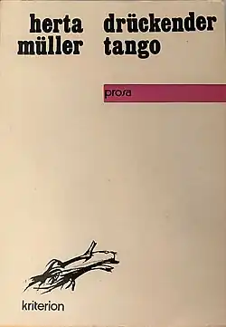 Müller's first book, Niederungen (Nadirs), was published in Romania in German in 1982, receiving a prize from the Central Committee of the Union of Communist Youth. The book was about a child's view of the German-cultural Banat.[9] Some members of the Banat Swabian community criticized Müller for "fouling her own nest" by her unsympathetic portrayal of village life.[10] Müller was a member of Aktionsgruppe Banat, a group of German-speaking writers in Romania who supported freedom of speech over the censorship they faced under Nicolae Ceaușescu's government, and her works, including The Land of Green Plums, deal with these issues.[11][12] Radu Tinu, the Securitate officer in charge of her case, denies that she ever suffered any persecutions,[13] a claim that is opposed by Müller's own version of her (ongoing) persecution in an article in the German weekly Die Zeit in July 2009.[14]