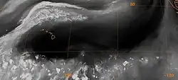 Satellite image showing a high-pressure area south of Australia, evidenced by the clearing in the clouds[1]
