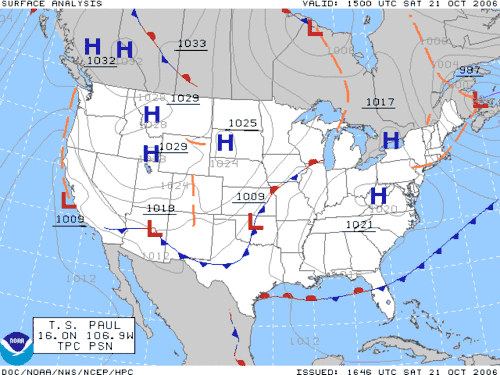 A surface weather analysis for the United States on 21 October 2006. High pressure areas are labeled "H".