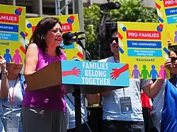 Term limits would have prevented Solis from seeking reelection to the State Senate.[16] After months of deliberation, she decided to run for the U.S. House of Representatives in 2000 against 18-year incumbent Matthew G. Martínez in the 31st congressional district, which consisted largely of working class Hispanics and Asians.[3] This action was criticized by Hispanics and others, and only two members of Congress, Barbara Boxer and Loretta Sanchez, supported her.[7][8] Martínez was more conservative than many of his constituents, as he had supported the North American Free Trade Agreement (NAFTA), opposed gun control, and supported bans on specific abortion procedures.[2][35] He was also criticized for lacking effort and neglecting his district.[3] Solis was able to obtain the support of the Los Angeles County Federation of Labor (which called her a "warrior for working families"),[8] Emily's List, Handgun Control Incorporation, the Sierra Club and the California League of Conservation Voters. With their help, Solis outspent Martínez by a 4-to-1 margin and had hundreds of volunteers working for her.[34]