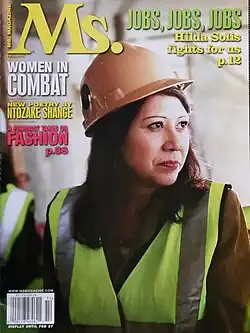 Due to her work in overcoming obstacles for environmental justice, in 2000 Solis was given the Profile in Courage Award by the John F. Kennedy Library Foundation, and was praised as "a politician who hasn't shied away from challenging the old boy network both within and without the Latino community".[30] She was the first woman to win the award,[34] and gained appearances in George and People magazines and on the Today show.[3] Art Torres, who had become California Democratic Party chair, said of Solis, "She's going to be a national star".[3]