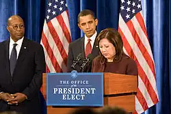 On December 18, 2008, sources close to the Obama transition team identified Solis as the President-elect's choice for Secretary of Labor, the last cabinet position yet to be filled.[61] The selection earned praise from the AFL–CIO and other labor organizations, but was not well received by business groups[40] and the anti-union group Center for Union Facts.[5] The official announcement was made by Obama on December 19.[5] Solis's successor was chosen in a special election in California's 32nd congressional district; she declined to endorse a candidate in the primary[62] (from which her past mentee Judy Chu emerged on top and eventually won the general election).[63]