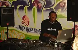 Hip-Hop evolved without rap as a requirement of the genre, but the two terms became functionally synonymous.[85] Hip-hop DJs continued the disco DJ practice of intermittently rapping with the crowd. As their duties became more complex, a Master of ceremonies (MC) was often present to introduce the DJ and hype the crowd.[86]