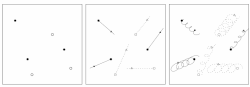 Principles of the astrometric measurements. Filled circles and solid lines show three objects from one field of view (about 1° in size), and open circles and dashed lines show three objects from a distinct sky region superimposed by virtue of the large basic angle. Left: object positions at one reference epoch. Middle: their space motions over about four years, with arbitrary proper motion vectors and scale factors; triangles show their positions at a fixed epoch near the end of the interval. Right: the total positional changes including the additional apparent motions due to annual parallax, the four loops corresponding to four Earth orbits around the sun. The parallax-induced motions are in phase for all stars in the same region of sky, so that relative measurements within one field can provide only relative parallaxes. Although the relative separations between the stars change continuously over the measurement period, they are described by just five numerical parameters per star (two components of position, two of proper motion, and the parallax).