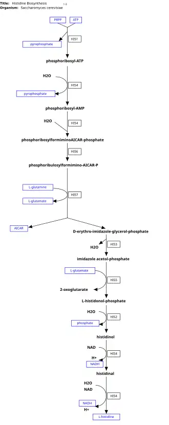 Histidine is synthesized from phosphoribosyl pyrophosphate (PRPP), which is made from ribose-5-phosphate by ribose-phosphate diphosphokinase in the pentose phosphate pathway. The first reaction of histidine biosynthesis is the condensation of PRPP and adenosine triphosphate (ATP) by the enzyme ATP-phosphoribosyl transferase. ATP-phosphoribosyl transferase is indicated by His1 in the image.[19] His4 gene product then hydrolyzes the product of the condensation, phosphoribosyl-ATP, producing phosphoribosyl-AMP (PRAMP), which is an irreversible step. His4 then catalyzes the formation of phosphoribosylformiminoAICAR-phosphate, which is then converted to phosphoribulosylformimino-AICAR-P by the His6 gene product.[20] His7 splits phosphoribulosylformimino-AICAR-P to form d-erythro-imidazole-glycerol-phosphate. After, His3 forms imidazole acetol-phosphate releasing water. His5 then makes l-histidinol-phosphate, which is then hydrolyzed by His2 making histidinol. His4 catalyzes the oxidation of l-histidinol to form l-histidinal, an amino aldehyde. In the last step, l-histidinal is converted to l-histidine.[20][21]