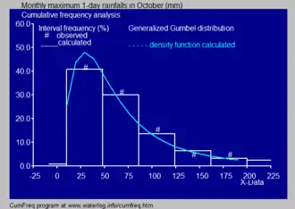 • In hydrology the histogram and estimated density function of rainfall and river discharge data, analysed with a probability distribution, are used to gain insight in their behaviour and frequency of occurrence.[27] An example is shown in the blue figure.