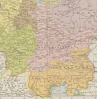 As the Roman Empire's control over these border regions crumbled, the ability of Raetia, Noricum, and Pannonia to defend themselves became increasingly problematic. A Gothic leader Radagaisus overran part of the country in 405.[9] After several raids on Italy, the Visigoths of Alaric I arrived in Noricum in 408.[10] As described by Zosimus, Alaric set out from Emona (modern Ljubljana) which lay between Pannonia Superior and Noricum over the Carnic Alps arriving at Virunum in Noricum, as had been agreed to by the Roman general Stilicho, following several skirmishes between the two. Alaric was voted a large amount of money to maintain peace, by the Roman Senate, at Stilicho's instigation.[10] From there he directed his operations against Italy, demanding Noricum among another territory, finally sacking Rome in 410 but dying on the route home that year.[11] During this period, in 409, Saint Jerome wrote a letter mentioning that many of the peoples from around the region east of Austria, even from within the empire, were occupying Gaul at that time: "Quadi, Vandals, Sarmatians, Alans, Gepids, Herules, Saxons, Burgundians, Allemanni and—alas! for the commonweal!—even Pannonians".[12]