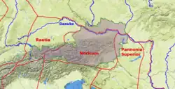 During Emperor Claudius's reign (41–54 AD), Noricum was bounded on the east approximately by the Vienna Woods, the current eastern border of Styria, and parts of the Danube, Eisack, Drava rivers. Under Diocletian (284–305), Noricum was divided along the main Alpine ridge into a north (Noricum ripense) and a south (Noricum Mediterraneum). Across the Ziller in the west, corresponding approximately to the present provinces of Vorarlberg and Tyrol, lay the province of Raetia. Present day Burgenland in the east was in Pannonia. To the south was Region 10, Venetia et Histria.[5] The Danubian limes, formed a defensive line separating Upper and Lower Austria from Germanic tribes, most importantly the Marcomanni.