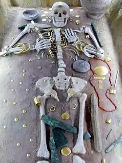 The Eneolithic Varna culture (5000 BC)[12] represents the first civilization with a sophisticated social hierarchy in Europe. The centrepiece of this culture is the Varna Necropolis, discovered in the early 1970s. It serves as a tool in understanding how the earliest European societies functioned,[13] principally through well-preserved ritual burials, pottery, and golden jewellery. The golden rings, bracelets and ceremonial weapons discovered in one of the graves were created between 4,600 and 4200 BC, which makes them the oldest gold artefacts yet discovered anywhere in the world.[14]