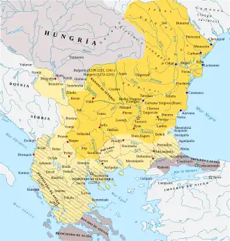 In the Battle of Adrianople in 1205, Kaloyan defeated the forces of the Latin Empire and thus limited its power from the very first year of its establishment. The power of the Hungarians and to some extent the Serbs prevented significant expansion to the west and north-west. Under Ivan Asen II (1218–1241), Bulgaria once again became a regional power, occupying Belgrade and Albania. In an inscription from Turnovo in 1230 he entitled himself "In Christ the Lord faithful Tsar and autocrat of the Bulgarians, son of the old Asen".