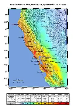 The most widely accepted estimate for the magnitude of the earthquake is a moment magnitude (Mw) or Richter magnitude (ML) of 7.8;[7] however, other values have been proposed, from 7.7 to as high as 8.25.[8] Shaking was felt from Oregon to Los Angeles, and inland as far as central Nevada.[9]