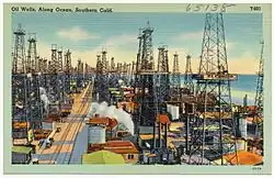 In 1920, oil production in California had expanded to 77 million barrels.[17] Between 1920 and 1930, new oil fields across southern California were being discovered with regularity, including Huntington Beach in 1920, Long Beach and Santa Fe Springs in 1921, and Dominguez in 1923.[17] Southern California had become the hotbed for oil production in the United States.