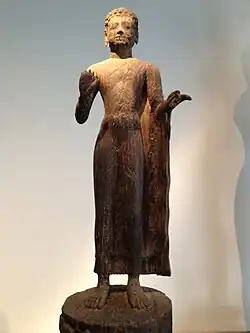 Chinese annals[41] contain detailed records of the first known organised polity, the Kingdom of Funan, on Cambodian and Vietnamese territory characterised by "high population and urban centers, the production of surplus food...socio-political stratification [and] legitimized by Indian religious ideologies".[42][43] Centered around the lower Mekong and Bassac rivers from the first to sixth century CE with "walled and moated cities"[44] such as Angkor Borei in Takeo Province and Óc Eo in modern An Giang Province, Vietnam.