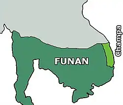 The history of Cambodia, a country in mainland Southeast Asia, begins with the earliest evidence of habitation around 5000 BCE.[1][2] Detailed records of a political structure on the territory of what is now Cambodia first appear in Chinese annals in reference to Funan, a polity that encompassed the southernmost part of the Indochinese peninsula during the 1st to 6th centuries. Centered at the lower Mekong,[3] Funan is noted as the oldest regional Hindu culture, which suggests prolonged socio-economic interaction with maritime trading partners of the Indosphere in the west.[4] By the 6th century a civilization, called Chenla or Zhenla in Chinese annals, firmly replaced Funan, as it controlled larger, more undulating areas of Indochina and maintained more than a singular centre of power.[5][6]