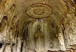 The Neolithic Age in China is considered to have begun about 10,000 years ago.[8] Because the Neolithic is conventionally defined by the presence of agriculture, it follows that the Neolithic began at different times in the various regions of what is now China. Agriculture in China developed gradually, with initial domestication of a few grains and animals gradually expanding with the addition of many others over subsequent millennia.[9] The earliest evidence of cultivated rice, found by the Yangtze River, was carbon-dated to 8,000 years ago.[10] Early evidence for millet agriculture in the Yellow River valley was radiocarbon-dated to about 7000 BC.[11] The Jiahu site is one of the best preserved early agricultural villages (7000 to 5800 BC). At Damaidi in Ningxia, 3,172 cliff carvings dating to 6000–5000 BC have been discovered, "featuring 8,453 individual characters such as the sun, moon, stars, gods and scenes of hunting or grazing", according to researcher Li Xiangshi. Written symbols, sometimes called proto-writing, were found at the site of Jiahu, which is dated around 7000 BC,[12] Damaidi around 6000 BC, Dadiwan from 5800 BC to 5400 BC,[13] and Banpo dating from the 5th millennium BC. With agriculture came increased population, the ability to store and redistribute crops, and the potential to support specialist craftsmen and administrators, which may have existed at late Neolithic sites like Taosi and the Liangzhu culture in the Yangtze delta.[10] The cultures of the middle and late Neolithic in the central Yellow River valley are known, respectively, as the Yangshao culture (5000 BC to 3000 BC) and the Longshan culture (3000 BC to 2000 BC). Pigs and dogs were the earliest-domesticated animals in the region, and after about 3000 BC domesticated cattle and sheep arrived from Western Asia. Wheat also arrived at this time but remained a minor crop. Fruit such as peaches, cherries and oranges, as well as chickens and various vegetables, were also domesticated in Neolithic China.[9]