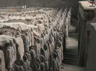 The Qin administration kept exhaustive records on their population, collecting information on their sex, age, social status and residence.[52] Commoners, who made up over 90% of the population,[53] "suffered harsh treatment" according to the historian Patricia Buckley Ebrey, as they were often conscripted into forced labor for the empire's construction projects.[54] This included a massive system of imperial highways in 220 BC, which ranged around 4,250 miles (6,840 km) altogether.[55] Other major construction projects were assigned to the general Meng Tian, who concurrently led a successful campaign against the northern Xiongnu peoples (210s BC), reportedly with 300,000 troops.[55][c] Under Qin Shi Huang's orders, Meng supervised the combining of numerous ancient walls into what came to be known as the Great Wall of China and oversaw the building of a 500 miles (800 km) straight highway between northern and southern China.[57] The emperor also oversaw the construction of his monumental mausoleum, which includes the well known Terracotta Army.[58]