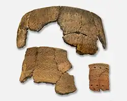 Around the beginning of 4th millennium BC Comb Ceramic culture arrived in Estonia.[8] Until the early 1980s the arrival of Balto-Finnic peoples, the ancestors of the Estonians, Finns, and Livonians, on the shores of the Baltic Sea was associated with the Comb Ceramic Culture.[9] However, such a linking of archaeologically defined cultural entities with linguistic ones cannot be proven, and it has been suggested that the increase of settlement finds in the period is more likely to have been associated with an economic boom related to the warming of climate. Some researchers have even argued that a Uralic language may have been spoken in Estonia and Finland since the end of the last glaciation.[10]