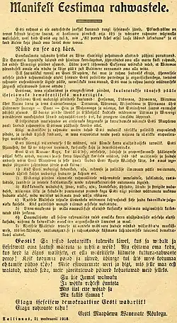 In February, after the collapse of the peace talks between Soviet Russia and the German Empire, mainland Estonia was occupied by the Germans. Bolshevik forces retreated to Russia. Between the Russian Red Army's retreat and the arrival of advancing German troops, the Salvation Committee of the Estonian National Council Maapäev issued the Estonian Declaration of Independence[35] in Pärnu on 23 February 1918.