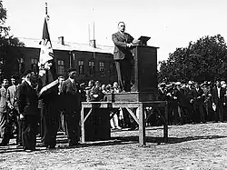 By January 1944, the front was pushed back by the Soviet Army almost all the way to the former Estonian border. Narva was evacuated. Jüri Uluots, the last legitimate prime minister of the Republic of Estonia (according to the Constitution of the Republic of Estonia) prior to its fall to the Soviet Union in 1940, delivered a radio address that implored all able-bodied men born from 1904 through 1923 to report for military service. (Before this, Uluots had opposed Estonian mobilization.) The call drew support from all across the country: 38,000 volunteers jammed registration centers.[54] Several thousand Estonians who had joined the Finnish army came back across the Gulf of Finland to join the newly formed Territorial Defense Force, assigned to defend Estonia against the Soviet advance. It was hoped that by engaging in such a war Estonia would be able to attract Western support for the cause of Estonia's independence from the USSR and thus ultimately succeed in achieving independence.[55]