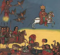 In around 1380, Dawit I campaigned against Egypt, reaching as far north as Aswan.[43] He initiated this campaign in an attempt to assist the Coptic Christians of Upper Egypt who he thought were being oppressed under Muslim rule and he felt he had the duty to protect them as he saw himself as the protector of Orthodox Christianity and the Copts in Egypt. In response, the Emir forced the Patriarch of Alexandria, Matthew I, to send a deputation to Dawit to persuade him to retire back to his kingdom. "There seems to be little or no doubt that, on the eve of the advent of the Burji dynasty of Mamluk Egypt, King Dawit had led his troops beyond the northern frontiers of his kingdom, and created much havoc among the Muslim inhabitants of the area who had been within the sphere of influence of Egypt since the thirteenth century."[41] The Emperor had a much friendlier relationship with the Sultan's successor, for according to the medieval historian al-Maqrizi, Dawit sent 22 camels laden with gifts to Berkuk, the first Sultan of the Burji dynasty.[43]