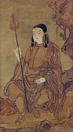 The Buddhist Soga clan took over the government in the 580s and controlled Japan from behind the scenes for nearly sixty years.[36] Prince Shōtoku, an advocate of Buddhism and of the Soga cause, who was of partial Soga descent, served as regent and de facto leader of Japan from 594 to 622. Shōtoku authored the Seventeen-article constitution, a Confucian-inspired code of conduct for officials and citizens, and attempted to introduce a merit-based civil service called the Cap and Rank System.[37] In 607, Shōtoku offered a subtle insult to China by opening his letter with the phrase, "The ruler of the land of the rising sun addresses the ruler of the land of the setting sun" as seen in the kanji characters for Japan (Nippon).[38] Through his influence, or very probably through the efforts of the Korean missionaries, the devastating war between the Japanese and Koreans was ended.[39] By 670, a variant of this expression, Nihon, established itself as the official name of the nation, which has persisted to this day.[40]