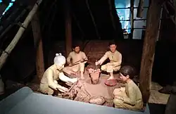 The Jōmon period of prehistoric Japan spans from roughly 13,000 BC[9] to about 1000 BC.[10] Japan was inhabited by a predominantly hunter-gatherer culture that reached a considerable degree of sedentism and cultural complexity.[11] The name Jōmon, meaning "cord-marked", was first applied by American scholar Edward S. Morse, who discovered shards of pottery in 1877.[12] This is a technique where a potter would roll clay into the shape of a rope, coil it upwards until it formed a jar or a bowl, and then bake it in open fire.[13] The pottery style characteristic of the first phases of Jōmon culture was decorated by impressing cords into the surface of wet clay.[14] Jōmon pottery is generally accepted to be among the oldest in East Asia and the world.[15] Pottery may have originated earlier, as Jōmon period hunter-gatherers crafted the world's oldest known ceramics around 14,500 BC.[16]